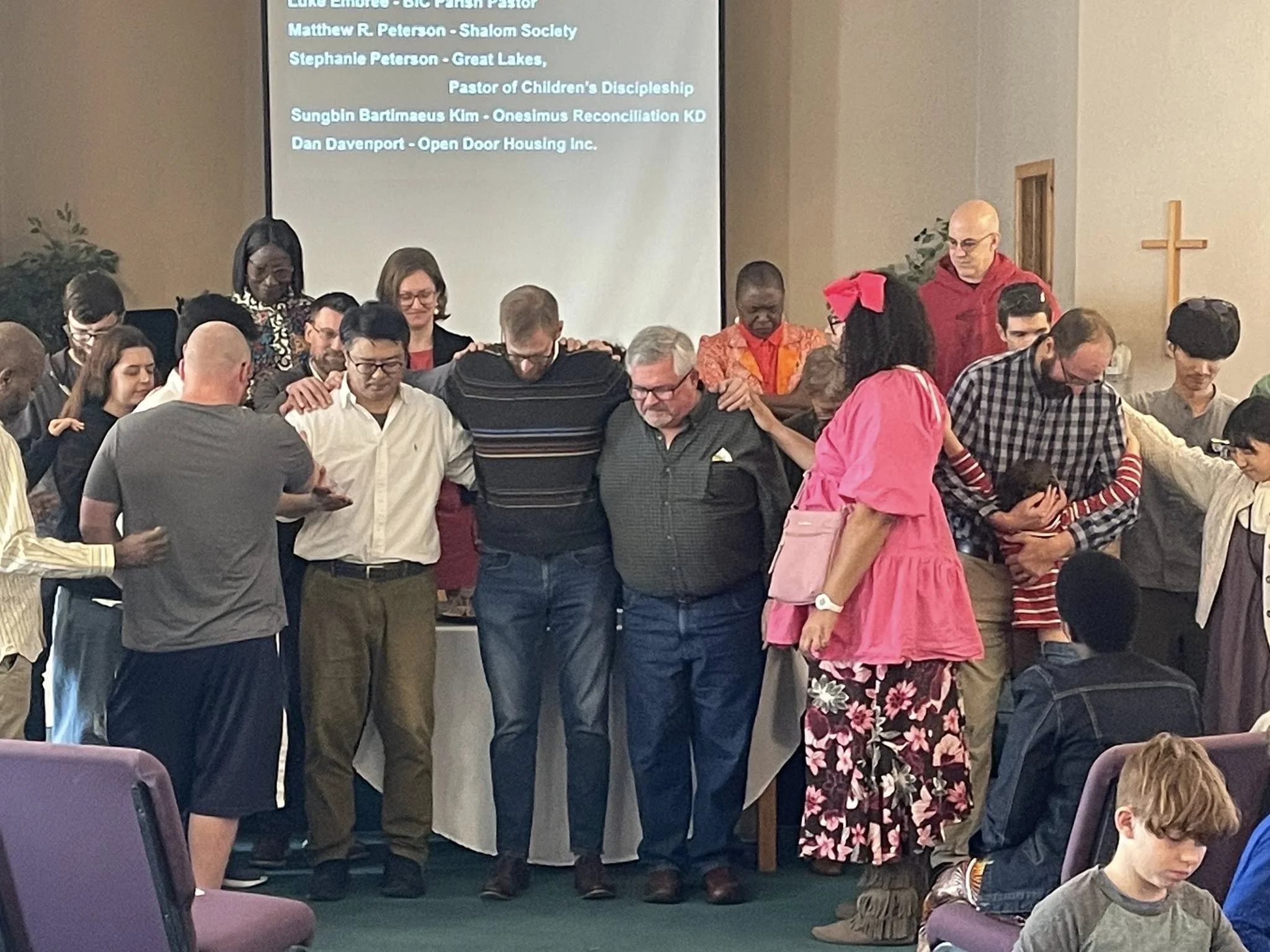 During our worship service, we commissioned Pastors Luke Embree and Stephanie Peterson for their work with the Great Lakes Conference, Pastor Matthew Peterson for his work with Shalom Society, Pastor Sungin Kim for his leadership in Onesimus Reconciliation, and Dan Davenport for his leadership of Open Door Housing, Inc. We heard testimonies from home church members, Tim Brown and Beth Gillock, and youth member, Rachelle Mugeni. We welcomed Ayo and the Mbera family as new members and celebrated the baptism of Tommy Kelly.