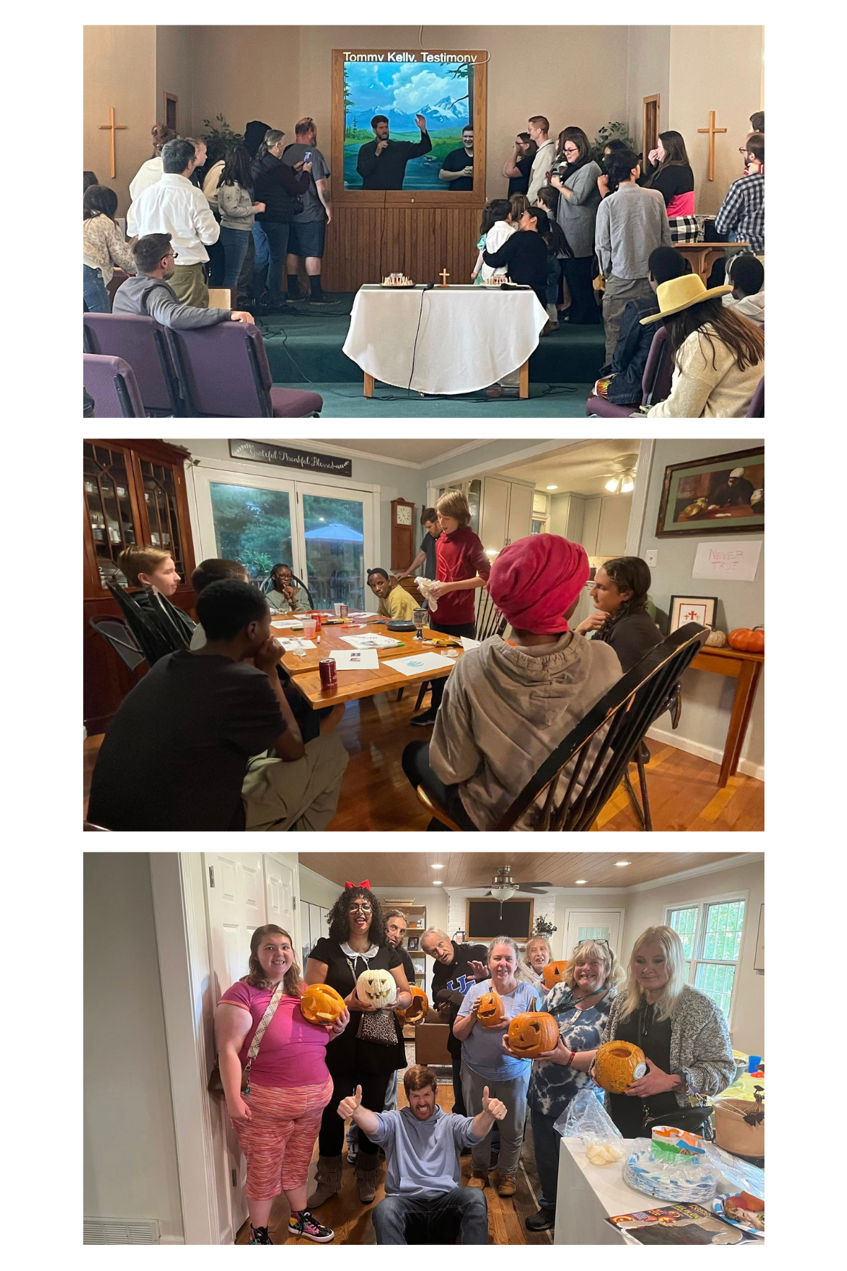 Pictured here are snapshots from our All-Community Celebration (Tommy’s Baptism), Youth & Young Adult Home Church sharing in communion, and our Lunch Bunch Home Church after their pumpkin patch visit!